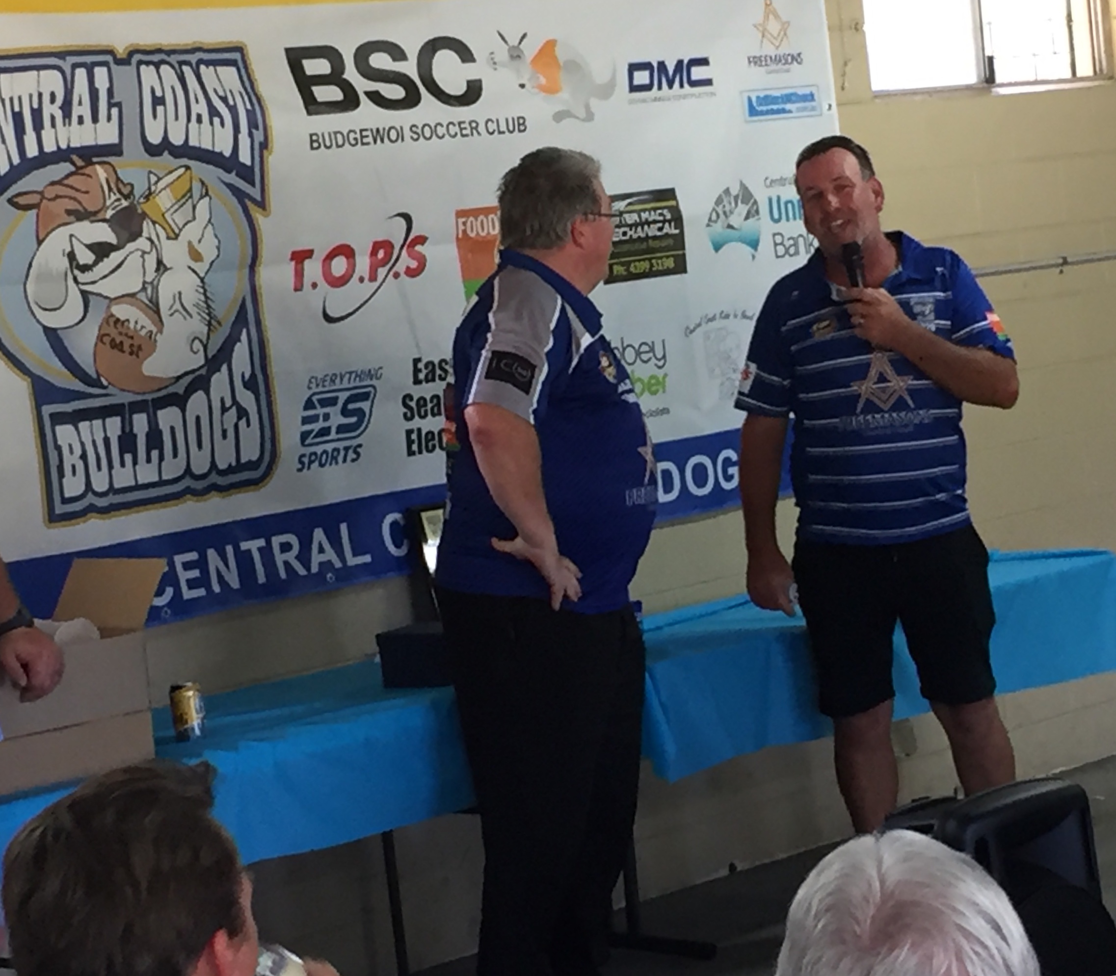 Then, in recognition of the ongoing support from Freemasons on the Central Coast, the Bulldogs presented a plaque and several CC Bulldogs polo shirts to FotCC president, Geoff Bown.