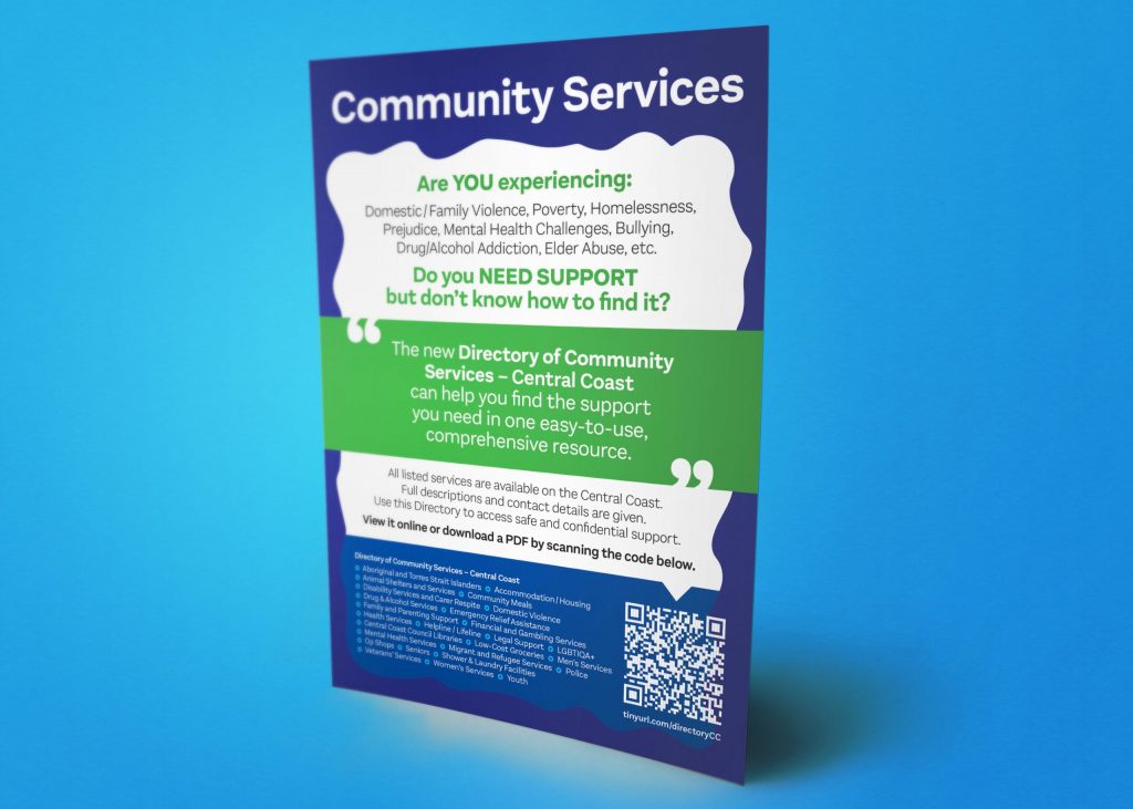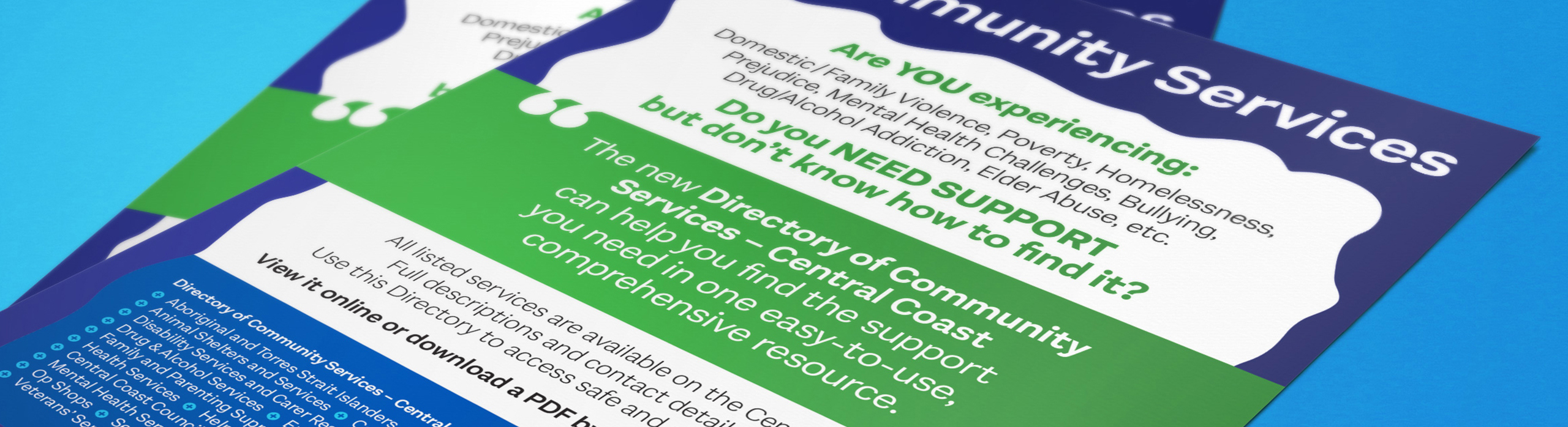 An estimated 5,000 printed Directories will also be produced and distributed to various agencies in the Central Coast local government area. This printed version will enable counsellors to have easy access to the services but more importantly will allow for Directories to be handed out to those who need them.